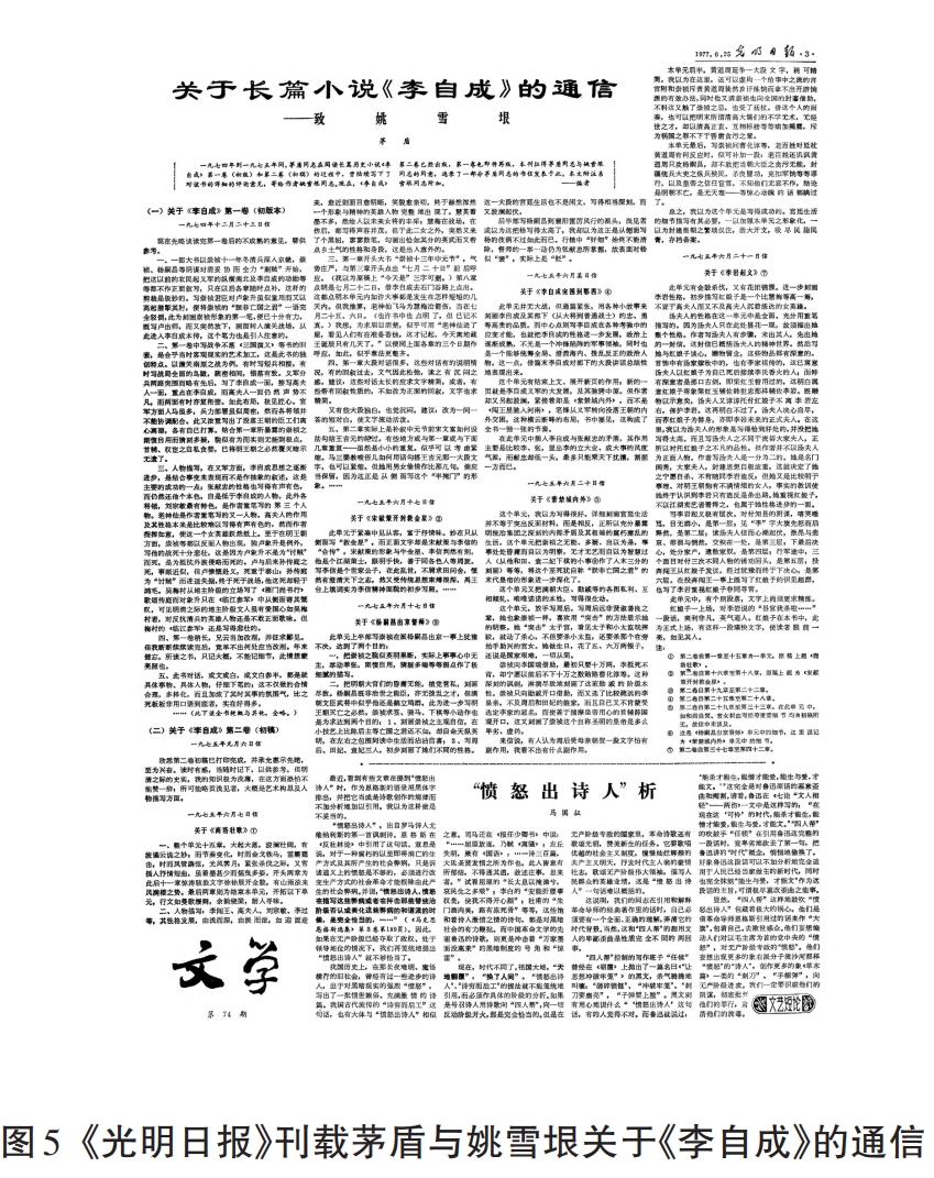 第二處,是茅盾提及了《光明日報(bào)》1977年6月25日刊載的《關(guān)于長篇小說<李自成>的通信》。這篇文章,是基于《李自成》第二卷上下冊出版的推介評論。1977年2、3月間(版權(quán)頁落款為1977年1月),《李自成》第二卷由中國青年出版社裝訂發(fā)行[11]94-95。茅盾于丁巳年正月初二(1977年2月19日)致王亞平信札時(shí),就對《李自成》的文學(xué)評價(jià)有自己的“期待”,“《李自成》第二卷第一冊問世,是一件大事,但愿文學(xué)刊物盡快評介,不知今日寫文學(xué)評論者有無余暇顧及此否?此所謂余暇,即在工農(nóng)兵作品之余,有無時(shí)間乃至興趣注意一個老作家所寫的長篇(其長恐必空前,因?yàn)槲覀兌贾廊珪8牛v史小說也?!盵6]120 《光明日報(bào)》、新華社很快都聚焦到《李自成》這部長篇?dú)v史小說,3月時(shí)新華社曾以中國新聞社的名義“用六種文字向海外報(bào)道了《李自成》的出版消息,又安排香港《新晚報(bào)》自三月廿七日起連載第一卷。本月中旬又向海外發(fā)了一篇約四千字的‘訪問記’,已經(jīng)同時(shí)在香港《大公報(bào)》、《文匯報(bào)》、《新晚報(bào)》以及《澳門日報(bào)》發(fā)表”[11]106?!豆饷魅請?bào)》于6月初動議發(fā)表茅盾致姚雪垠的部分書信,最終這批摘錄信札由姚雪垠摘抄、茅盾校訂之后,于6月25日在該報(bào)第3版《文學(xué)》副刊第74期登載。