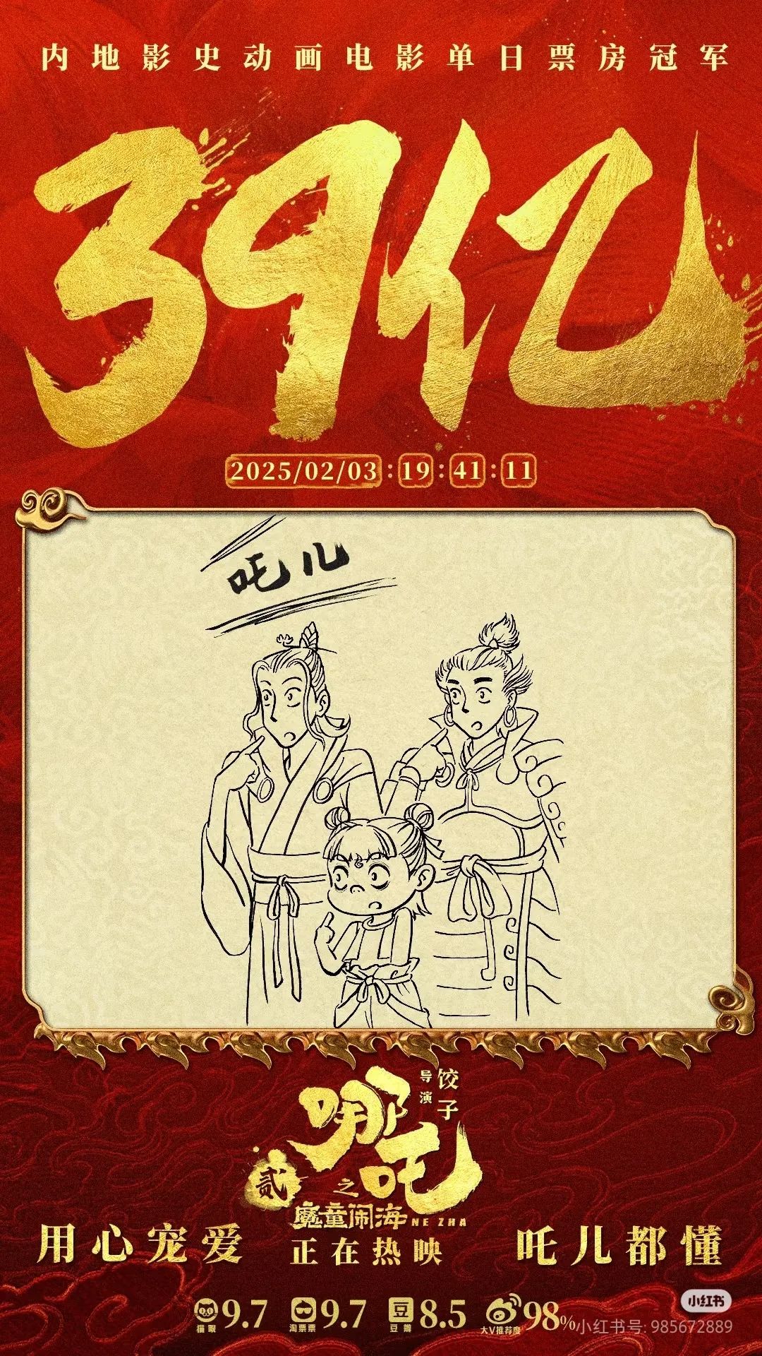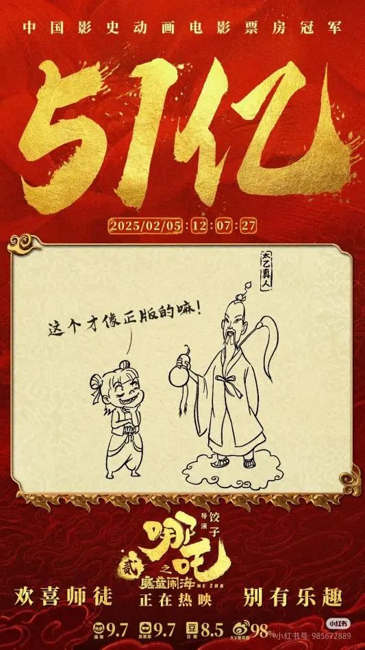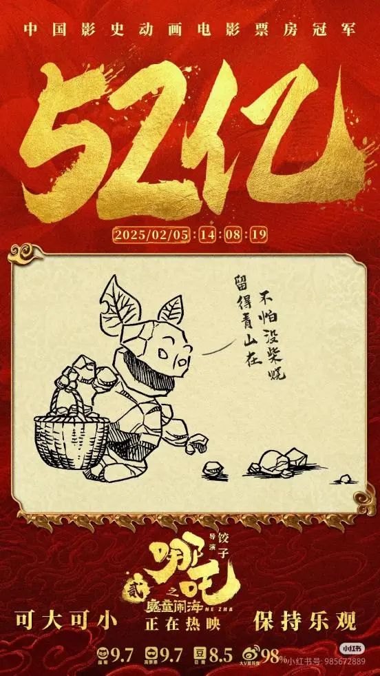 2025年春節(jié)期間,六部前期宣傳頗豐、影迷期盼已久的“重磅電影”同時(shí)上映,被稱為史上最強(qiáng)春節(jié)檔,競(jìng)爭(zhēng)激烈可想而知。暌違五年,與偵探推理、神話史詩、武俠、軍事等各路強(qiáng)悍IP同場(chǎng)競(jìng)技,作為中國影史動(dòng)畫票房冠軍續(xù)作的《哪吒之魔童鬧?!穭?shì)如破竹,粉碎“續(xù)作難出佳作”的魔咒,續(xù)寫了中國動(dòng)畫影史的神話。據(jù)燈塔專業(yè)版數(shù)據(jù)顯示,截至2月6日,影片票房已突破58億元,超過《長(zhǎng)津湖》成為中國影史票房第一,同時(shí)成為中國影史春節(jié)檔票房冠軍。與此同時(shí),數(shù)據(jù)仍在不斷翻新當(dāng)中,有網(wǎng)友戲稱,“吒兒的含金量還在不斷上升”,一盞茶的工夫,紀(jì)錄就有可能以億元為單位被不斷刷新。影片制作方之一彩條屋影業(yè)小紅書官方號(hào)甚至成為眾多影迷、網(wǎng)友“喊話”餃子導(dǎo)演的留言板,“正是拼的年紀(jì),不能躺,快起來開拍哪吒三啦”。
