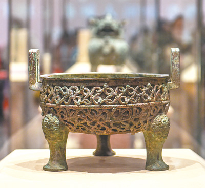 山西省石樓縣蘭家溝村出土的商代蛇首扁柄斗是目前國內(nèi)發(fā)現(xiàn)最早的帶有蛇形象的青銅器。這是一件酒器,柄首飾蛙,蛙兩側(cè)有兩條弓身、卷尾的蛇。這種蛇與蛙組合的裝飾是北方系青銅器特有的題材,頗具草原文化色彩。山西省新絳縣橫橋鎮(zhèn)出土的春秋時期蟠蛇紋鏤空鼎,鼎腹有內(nèi)外兩層,外層頸和底之間飾有兩周鏤空蟠蛇紋,群蛇蜿蜒游走,競相爭斗,動感十足。銅鼎外層鏤空鑄造群蛇是范鑄工藝難以做到的,是古代工匠用“失蠟法”鑄造銅器的最早范例之一。