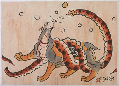 墓葬壁畫為了解古代社會提供了珍貴的圖像材料。礦物質(zhì)顏料繪制的壁畫顏色經(jīng)久不褪,畫中的蛇或出現(xiàn)在神話傳說場景里,或與人間煙火相伴,反映了古人豐富的想象力和精神信仰。山西忻州九原崗北朝壁畫墓中發(fā)現(xiàn)了鳥銜蛇和神獸銜蛇的圖案,象征著驅(qū)除升天途中的邪障,護(hù)佑墓主順利升天。《山海經(jīng)》記載:“大荒之中,有山名曰北極天柜,海水北注焉……又有神,銜蛇操蛇,其狀虎首人身,四蹄長肘,名曰強(qiáng)良。”銜蛇圖出現(xiàn)在墓葬中,也有鎮(zhèn)守墓室、庇護(hù)墓主人安寧的意義。山西右玉寶寧寺明代“大威德焰發(fā)德迦明王”水陸畫中的蛇形象與神佛相伴,庇佑人間。蛇在畫中不僅是一種裝飾,更體現(xiàn)了古人的精神寄托,希望借助蛇的神秘力量驅(qū)邪避災(zāi),保佑風(fēng)調(diào)雨順、國泰民安。