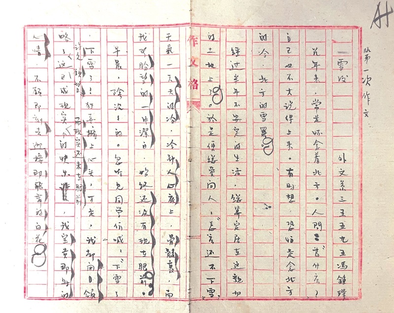 在《雪后》手稿首頁的最右側(cè),豎行題寫著五個字:“第一次作文”。想來是作文發(fā)下來后,宗璞先生在上面寫的吧?
