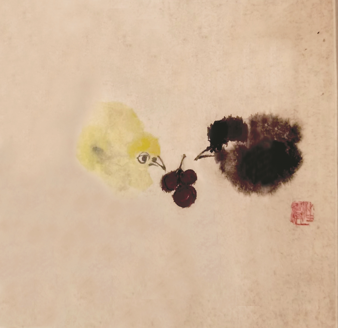 那是宗璞先生第一次向汪曾祺先生討畫:“不想一周內(nèi)便來了一幅斗方。兩只小雞,毛茸茸的,歪著頭看一串紫紅色的果子,很可愛。果子似乎很酸,所以小雞在琢磨罷?!保ā度鶊D》)隨后,汪曾祺先生又給宗璞先生畫了一幅牡丹圖并題詩:“人間存一角,聊放側(cè)枝花,臨風亦自得,不共赤城霞?!贝送?,還有一幅水仙圖和一幅寫意荷花圖。
