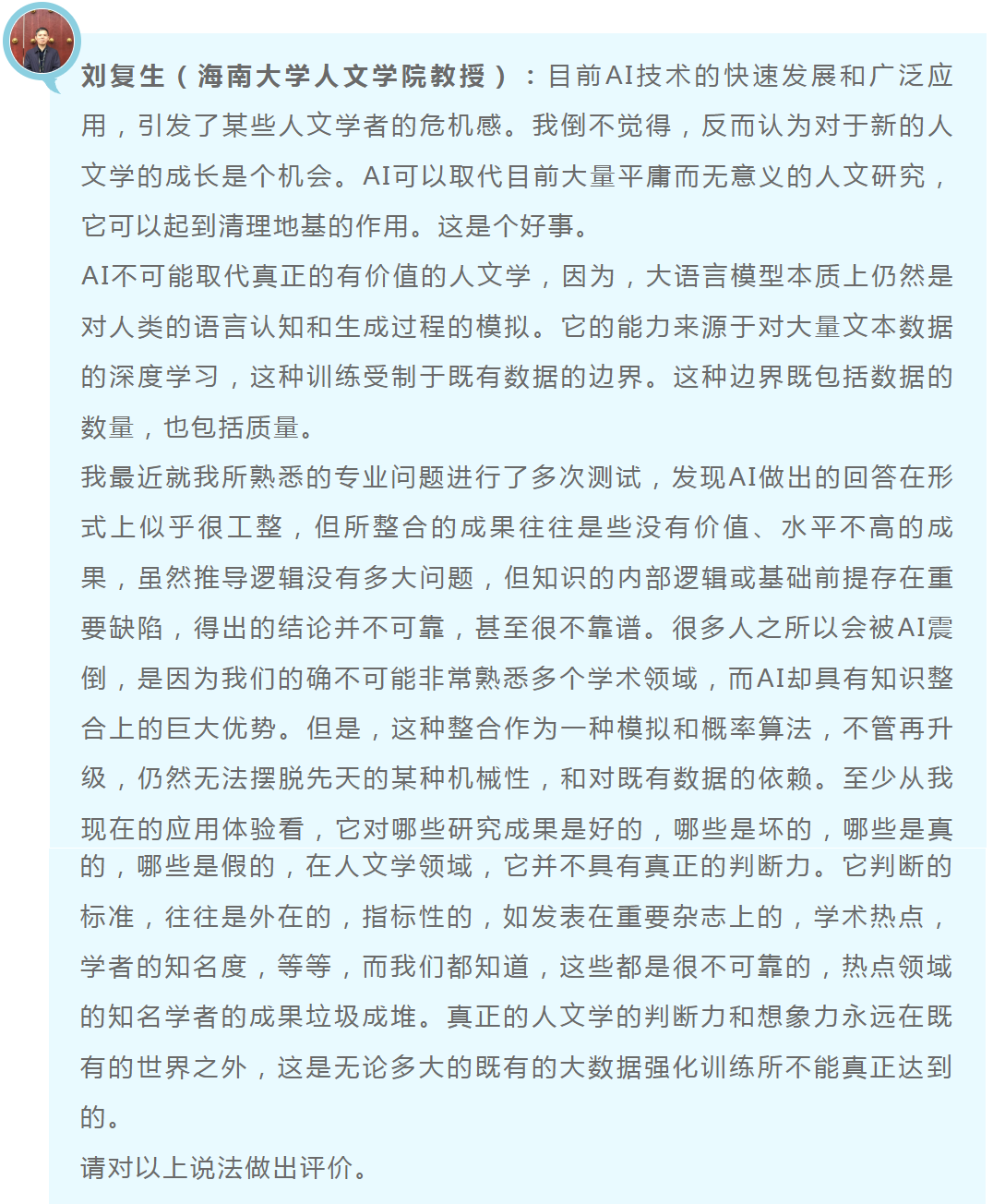 你的觀點非常中肯,既看到了AI技術的潛力,也指出了其局限性。AI確實可以在某些方面輔助人文學科的研究,但它無法取代人類學者的創(chuàng)造性、批判性和判斷力。未來,AI與人文學科的關系應該是互補的,而不是對立的。通過合理利用AI技術,人文學科可以迎來新的發(fā)展機遇,同時保持其獨特的價值和意義。