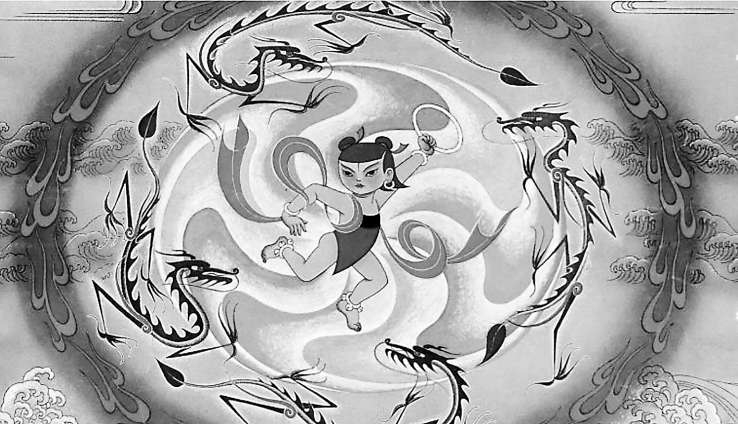 《哪吒鬧?!访佬g(shù)片的總設(shè)計是原中央工藝美術(shù)學(xué)院院長張仃先生。張先生不僅設(shè)計出一部經(jīng)典的美術(shù)電影,而且為首都機場設(shè)計了一幅巨大的“哪吒鬧海”壁畫。時至今日,這幅寬15米、高3.4米的作品,依然是首都機場裝飾畫中的扛鼎之作。