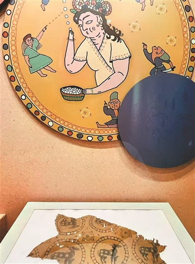 “絲綢的故事——古今中外再想象”展覽中展出的唐代黃地聯(lián)珠團窠鹿紋錦殘片和藝術(shù)家作品。