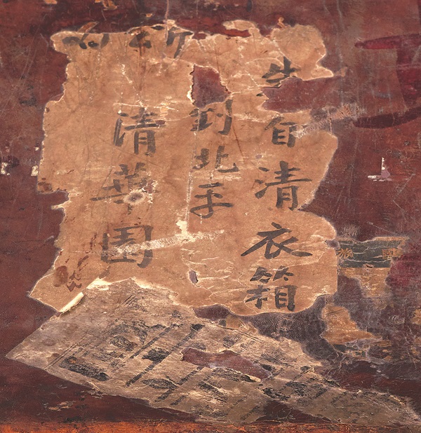 朱自清衣箱的形制是歐式的,國外工藝,使人自然聯(lián)想到朱自清留學(xué)歐洲的情形。朱自清衣箱正面還有一處極微小的殘留,是“Pe”和“RA”。不同于前面“青島”“膠濟(jì)鐵路”的中外文對照,這兩處只有幾個(gè)外文字母,此處紙張比“青島”殘留紙張年代更久。