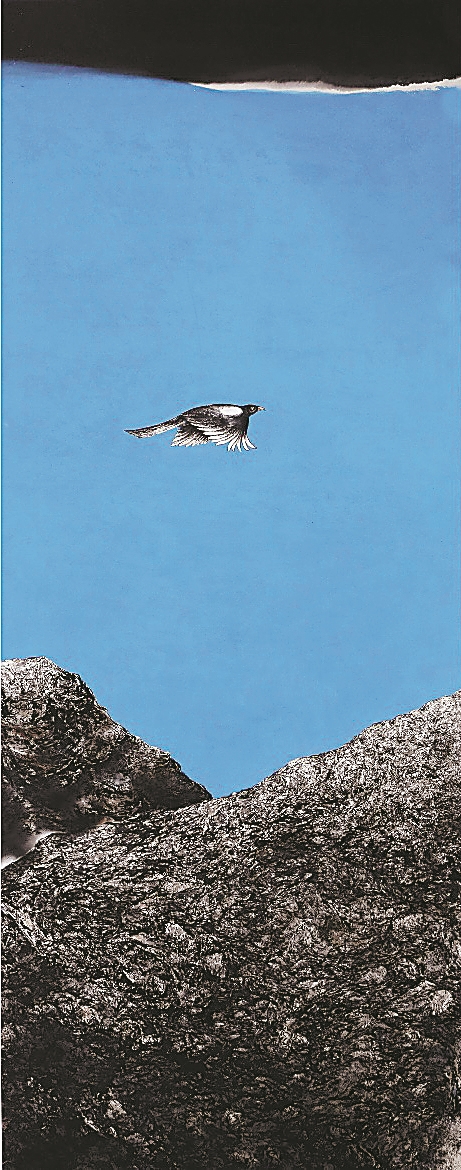 易新建的山水畫以大開大合的構(gòu)圖建構(gòu)和宏偉雄闊的神韻,通過工致細(xì)密的皴法反復(fù)積染、疊加得以形成頗具節(jié)奏感和韻律感的亞抽象意境,這種神韻和意境亦真亦幻、亦虛亦實,“惚兮恍兮,其中有象,恍兮惚兮,其中有物”。在他筆下,意象圖式暗藏云蒸霞蔚、巍峨巨嶂、奔流江河、清泉印月、羚羊佇立、飛鳥凌空,無一不蘊(yùn)含著藝術(shù)家對萬物的情懷、對山河的摯愛以及由此產(chǎn)生的心境傾訴,藝術(shù)家的心靈徜徉于超越時空、幽邃靜謐的審美幻境,在天澄水清、氣韻升騰的寰宇間格物致知、放逸情思……易新建將中國傳統(tǒng)山水畫與西方素描的黑白灰關(guān)系、油畫的光影變化以及版畫的切割式力感、設(shè)計的創(chuàng)意性互滲融會,由此走向了頗具新語境和新境象的當(dāng)代山水畫拓新之路。