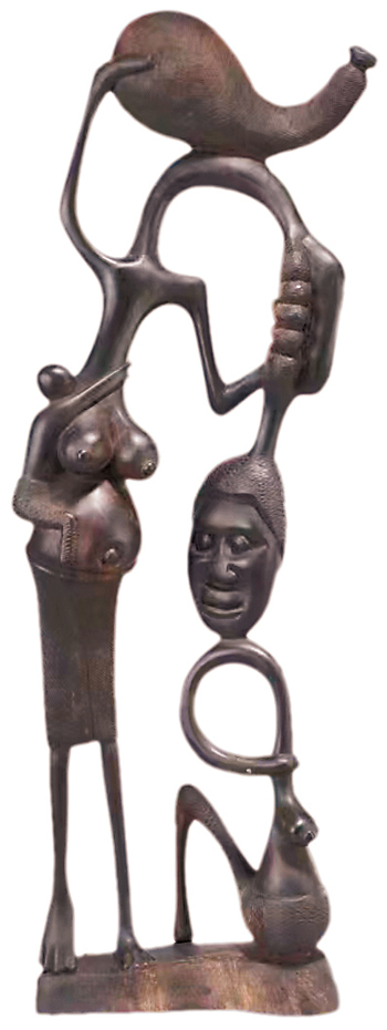 自1999年11月始,達(dá)斯塔尼的創(chuàng)作風(fēng)格又有了新的變化和突破,他用不規(guī)則的木段做材料,根據(jù)木段本身的原始形狀,只在部分位置稍加雕琢,創(chuàng)作出一批風(fēng)格鮮明的作品。有的僅在木料上動(dòng)寥寥數(shù)刀就成就了一件經(jīng)典之作,如烏木雕《祖母印象》,創(chuàng)作于1999年12月。有一天,達(dá)斯塔尼來到我們?cè)谶_(dá)累斯薩拉姆的藝術(shù)基地,看見中國(guó)木匠正在我家木門上雕刻圖案,那是具有中國(guó)傳統(tǒng)風(fēng)格的梅花鹿、仙鶴、松鼠,他對(duì)我說:“他們雕刻的是中國(guó)風(fēng)格,我能雕出馬孔德風(fēng)格的作品。”說罷就朝堆放木頭的地方奔去,從我們從鋸木廠運(yùn)來的邊角料中選出一塊還帶著樹皮的長(zhǎng)形烏木板。過了兩天,他興沖沖地來了,手里提著一個(gè)塑料袋,里邊就裝著這件名為《祖母印象》的作品。當(dāng)打開袋子時(shí),我開始感到詫異,為什么稱這件沒有任何具象表達(dá)的作品為“祖母”?我突然想到要換個(gè)思維模式欣賞它,于是瞇起雙眼,轉(zhuǎn)動(dòng)大腦,細(xì)心體會(huì)——原來這是作者心中的祖母,一個(gè)婀娜嫵媚的美麗婦人。作者在作品中注入了對(duì)祖母的無限崇敬和欣賞,他通過《祖母印象》向世人傳遞著對(duì)女性的尊重與崇敬,這件雕塑也開創(chuàng)了馬孔德現(xiàn)代雕塑的新形式。