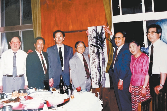 中國作家代表團(tuán)拜訪陳舜臣的合影 左起:林希、敖斯?fàn)?、蔣子龍、陳舜臣、管樺、蔡錦敦、陳喜儒