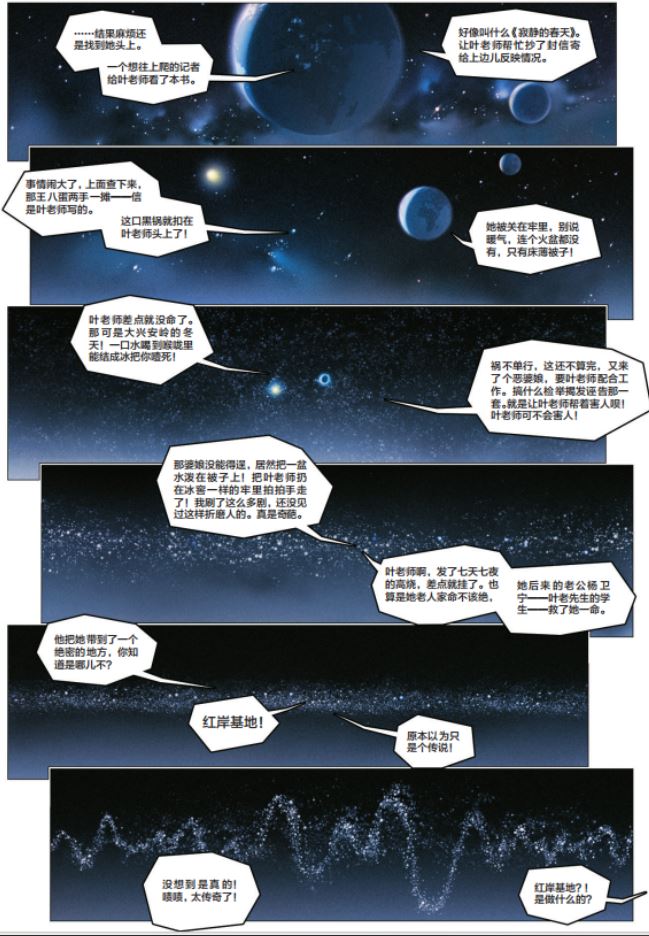 宇宙尺度由近至遠(yuǎn),通過(guò)兩頁(yè)圖就將葉文潔的過(guò)往都交待了