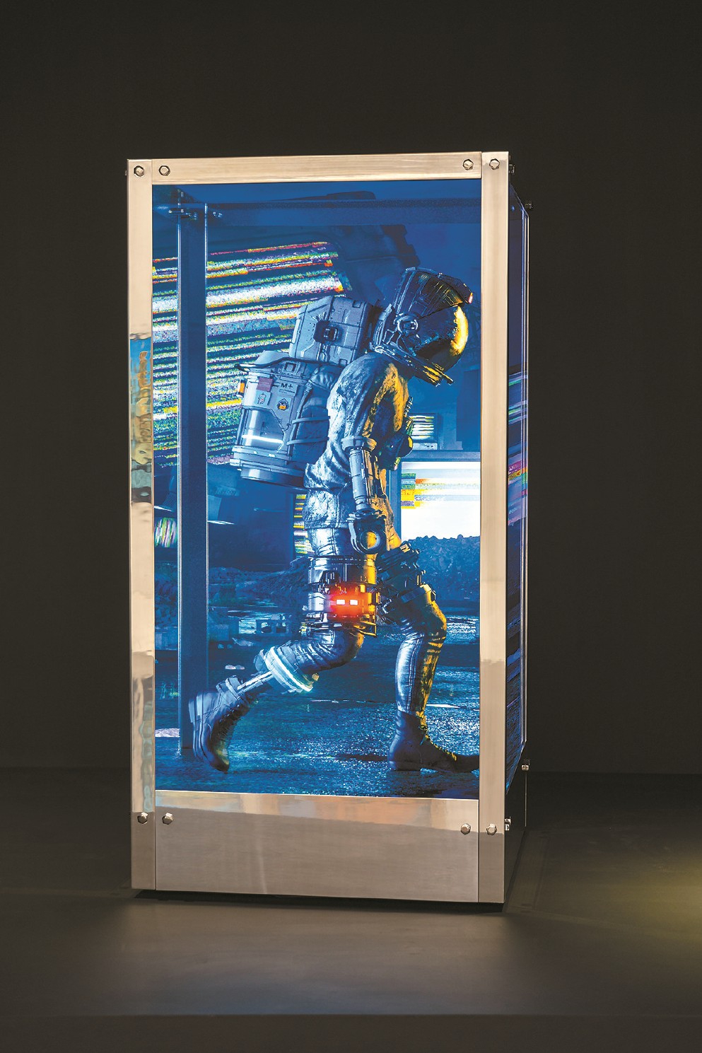 在動態(tài)雕塑《人類一號》(2021年)過程中,Beeple試圖通過作品在美術館與博物館系統(tǒng)中的生長與巡回性展覽,來挑戰(zhàn)作品的生命長度?!度祟愐惶枴肥荁eeple創(chuàng)作的首件動態(tài)雕塑作品。立方體中,身著宇航服與頭盔的“旅行者”是第一位誕生于元宇宙虛擬世界的人。他于2021年10月亮相,已走過第一章“人類誕生”(佳士得紐約洛克菲勒中心藝廊)、第二章“一場持久戰(zhàn)”(意大利都靈利沃利城堡當代藝術館)、第三章“兔年”(香港M+博物館)、第四章“完全消失”(美國水晶橋博物館)、第五章“奇點:第一階段”(南京德基藝術博物館),目前正走在第六章“半人工虹”(日本東京森美術館),并將永不停歇地走在變幻無窮的虛擬景觀中。