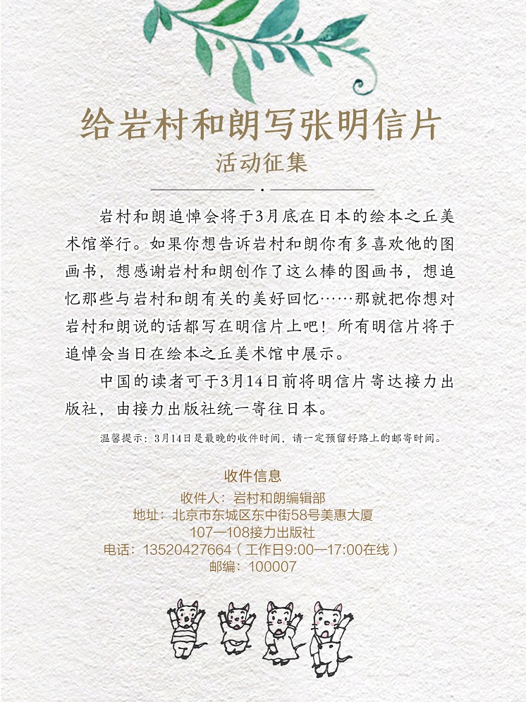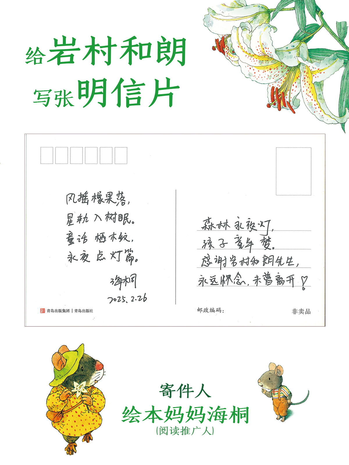 為深切緬懷巖村和朗,接力出版社于2025年2月發(fā)起了“給巖村和朗寫張明信片”活動,誠摯邀請廣大讀者通過郵寄明信片的方式,寄托對巖村和朗的無盡追思。