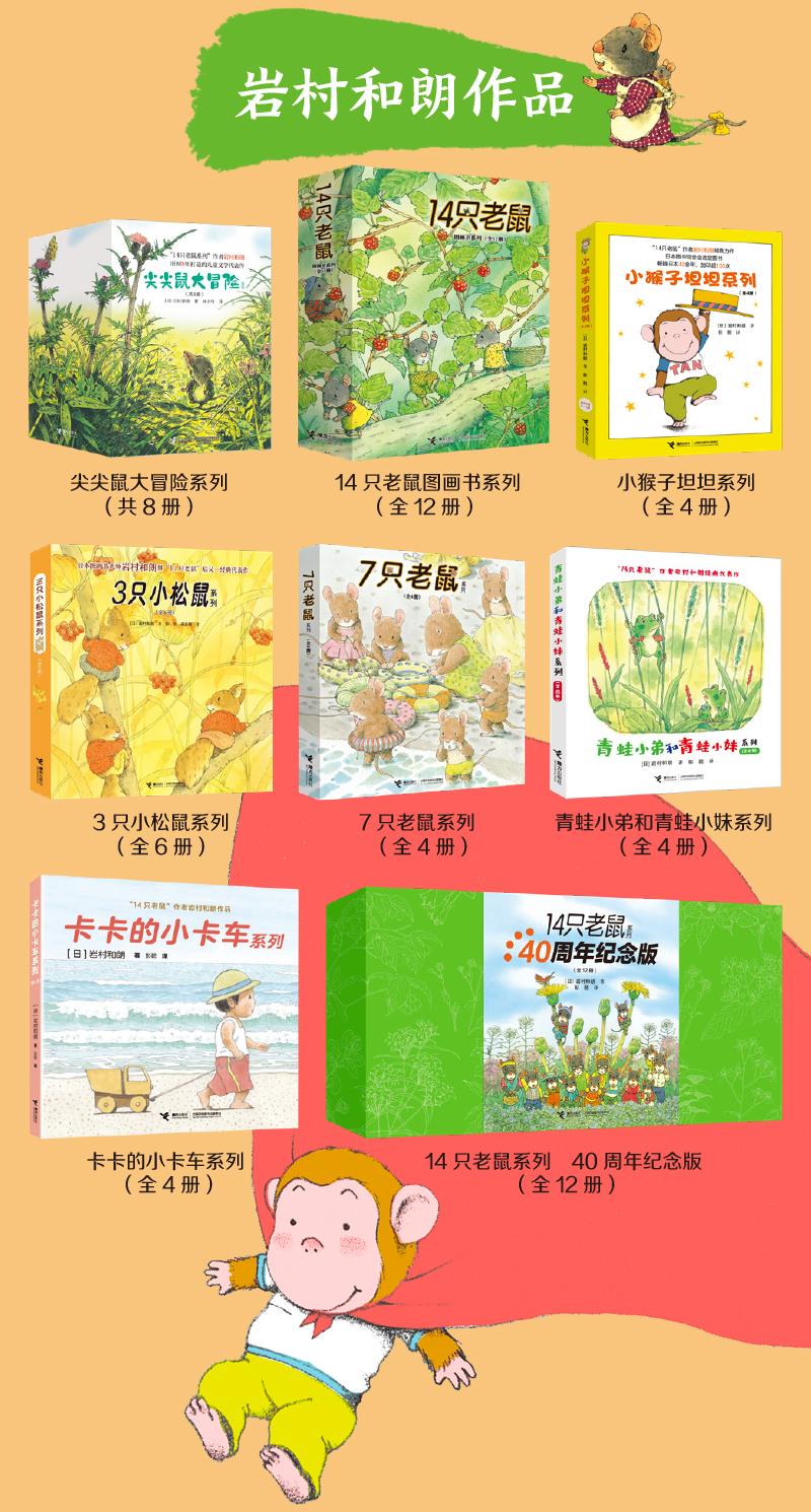 巖村和朗一生創(chuàng)作頗豐,著有“14只老鼠系列”“7只老鼠系列”“3只小松鼠系列”“小猴子坦坦系列”“卡卡的小卡車系列”等諸多經(jīng)典作品。這些作品不僅在日本備受贊譽,還被翻譯成法、德、韓等多種文字,在國際上廣泛傳播,多次斬獲各類重要獎項。其中,《14只老鼠吃早餐》榮獲日本繪本獎,《14只老鼠挖山藥》《7只老鼠挖紅薯》榮獲小學(xué)館繪畫獎,《一個人的末班車》榮獲產(chǎn)經(jīng)兒童出版文化獎,《愛思考的青蛙》獲講談社出版文化獎繪本獎。2014年,巖村和朗更是憑借其卓越成就,榮獲法蘭西藝術(shù)與文學(xué)勛章中的騎士勛位。