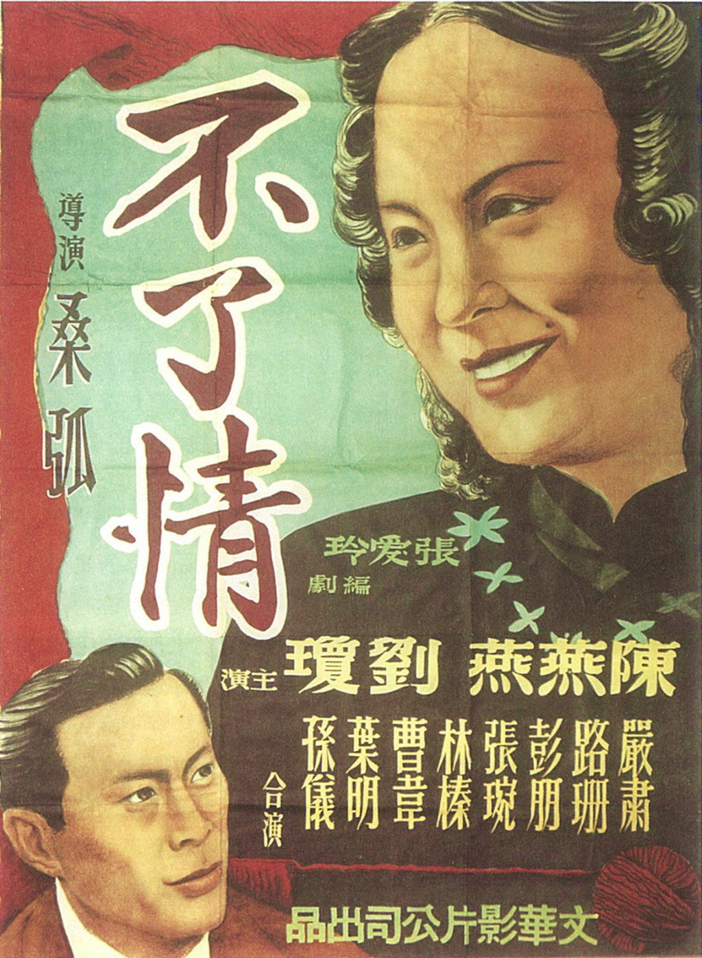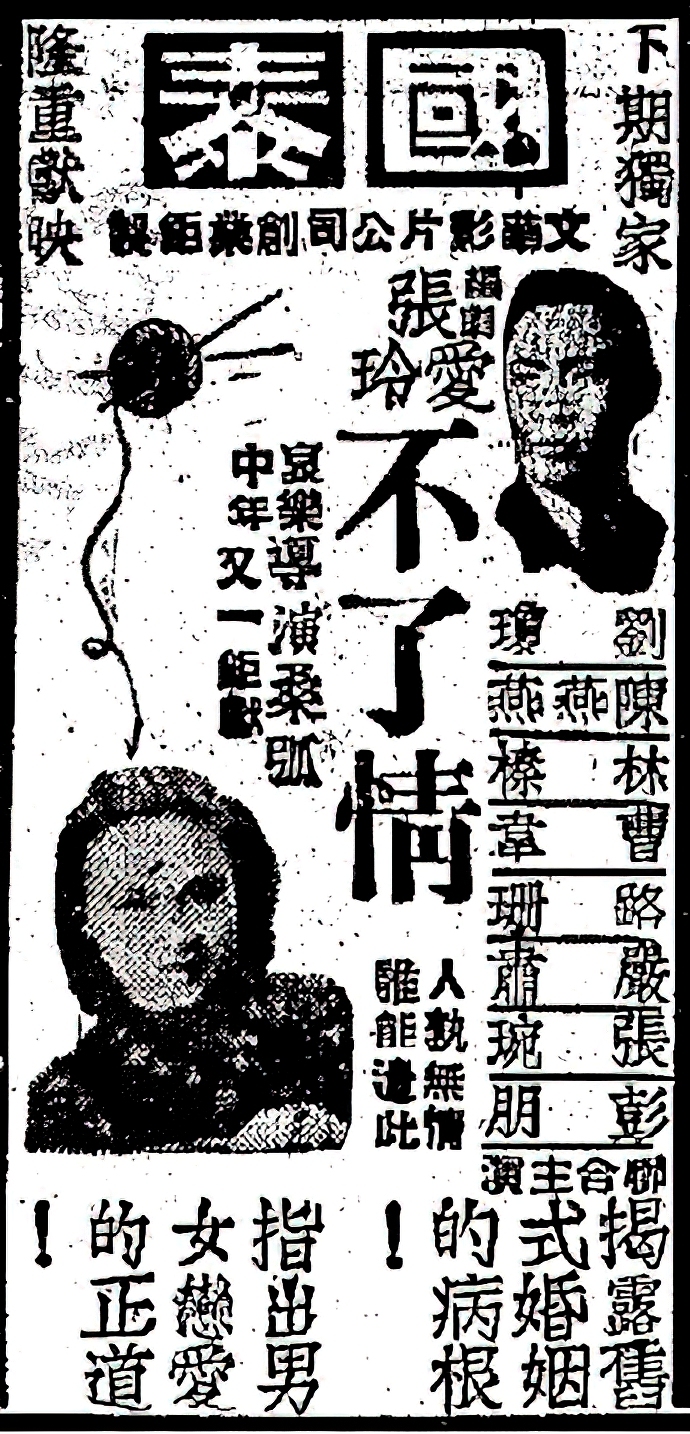 緊接著,情感的拉絲更細(xì)更密也更長的《不了情》在國泰戲院登場。電影海報(bào)上有對“健康的主題”宣告:“揭露舊式婚姻的病根!指出男女戀愛的正道!”(電影《不了情》廣告,香港《大公報(bào)》1951年5月21日);也有以導(dǎo)演之名趁熱打鐵的召集:“《哀樂中年》導(dǎo)演?;∮忠痪瞢I(xiàn)”“本院連滿一百一十場之《哀樂中年》大導(dǎo)演”(電影《不了情》廣告,香港《大公報(bào)》1951年5月24日);不過,比導(dǎo)演名更居視覺中心、字體也更大的是編劇“張愛玲”。此時(shí)的張愛玲,還在解放后的上海:她以筆名“梁京”在《亦報(bào)》上連載了長篇小說《十八春》,?;∑诖@是她“創(chuàng)作生活上的再出發(fā)”(叔紅[桑弧]:《推薦梁京的小說》,上海《亦報(bào)》1950年3月24日),她也以這個(gè)筆名為?;?dǎo)演的新片《太平春》寫了影評;她還在夏衍的關(guān)注下,參加了“上海市第一屆文學(xué)藝術(shù)工作者代表大會(huì)”。因?yàn)椤恫涣饲椤?,她的名字出現(xiàn)在香港海報(bào)和報(bào)紙上的時(shí)候,《十八春》已在報(bào)上連載完,她可能為單行本的出版忙著修訂,也可能已經(jīng)在著手寫中篇小說《小艾》,幾個(gè)月后它又將在《亦報(bào)》上連載。