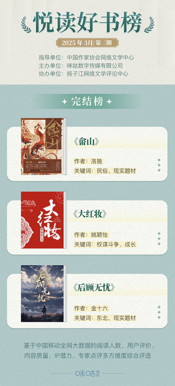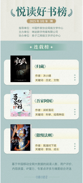 3月15日,由中國(guó)作家協(xié)會(huì)網(wǎng)絡(luò)文學(xué)中心指導(dǎo),咪咕數(shù)字傳媒有限公司主辦、揚(yáng)子江網(wǎng)絡(luò)文學(xué)評(píng)論中心協(xié)辦的“悅讀好書榜”活動(dòng)發(fā)布了第三期榜單。本期榜單延續(xù)設(shè)置了“悅讀新書榜”“悅讀連載榜”“悅讀完結(jié)榜”三個(gè)子榜,基于中國(guó)移動(dòng)大數(shù)據(jù)分析與權(quán)威專家評(píng)審,遴選出兼具市場(chǎng)熱度與文學(xué)價(jià)值的優(yōu)質(zhì)作品。南京師范大學(xué)文學(xué)院教授、博士生導(dǎo)師李瑋,山東大學(xué)文學(xué)院院長(zhǎng)、山東作協(xié)主席黃發(fā)有,北京大學(xué)中文系教授、文學(xué)講習(xí)所副所長(zhǎng)邵燕君三位資深評(píng)論家作為本期評(píng)審專家,從文學(xué)性、創(chuàng)新性與社會(huì)價(jià)值維度對(duì)上榜作品進(jìn)行了專業(yè)點(diǎn)評(píng)與解讀。