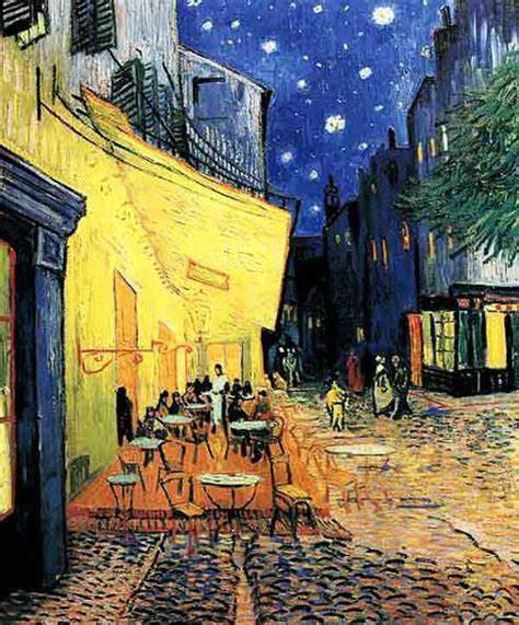 “夜晚的色彩比白天更加生動(dòng)、更加豐富”。在表現(xiàn)《夜間的露天咖啡座》時(shí),梵高使得咖啡廳明亮的黃色與藍(lán)色形成了鮮明的對比。盡管畫的是夜晚,但沒有一絲黑暗,天空是濃郁的藍(lán)色,遠(yuǎn)處的房屋是深藍(lán)色,近處的咖啡館墻面是黃色,露天平臺是橙色,地面則是黃橙色向藍(lán)色的過渡。這種鮮艷的色彩和視覺上的強(qiáng)烈對比是阿爾勒賦予梵高的。梵高的早期作品受荷蘭傳統(tǒng)繪畫(如倫勃朗)和現(xiàn)實(shí)主義畫派影響,色調(diào)以灰暗、深沉為主,常用棕色、黑色和暗綠色,整體氛圍壓抑。如在《吃土豆的人》(1885年)中,畫面以深褐色調(diào)為主,僅通過微弱的光線突出人物的質(zhì)樸與貧困。
