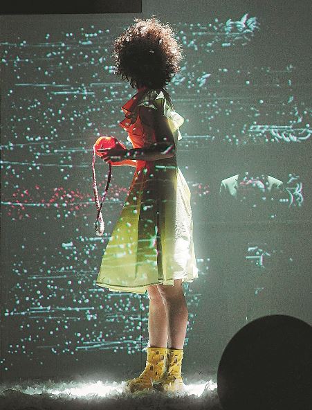 在《1033》的舞臺(tái)上,雖然影像營造的夢(mèng)境是豐富且光怪陸離的,但整個(gè)劇目只有兩位演員飾演的兩個(gè)角色:女主人和她的狗狗。兩位演員非常投入,無論是肢體語言溝通還是對(duì)白互動(dòng),表情生動(dòng)、動(dòng)作絲滑、配合默契,將一位“追求夢(mèng)想”的女主人和一只“善解人意”陪伴左右的寵物狗塑造得鮮活而有個(gè)性。這兩個(gè)角色在劇情推進(jìn)中相互獨(dú)立又相互輔助,不分主次,構(gòu)成了獨(dú)特的二元敘事模式。