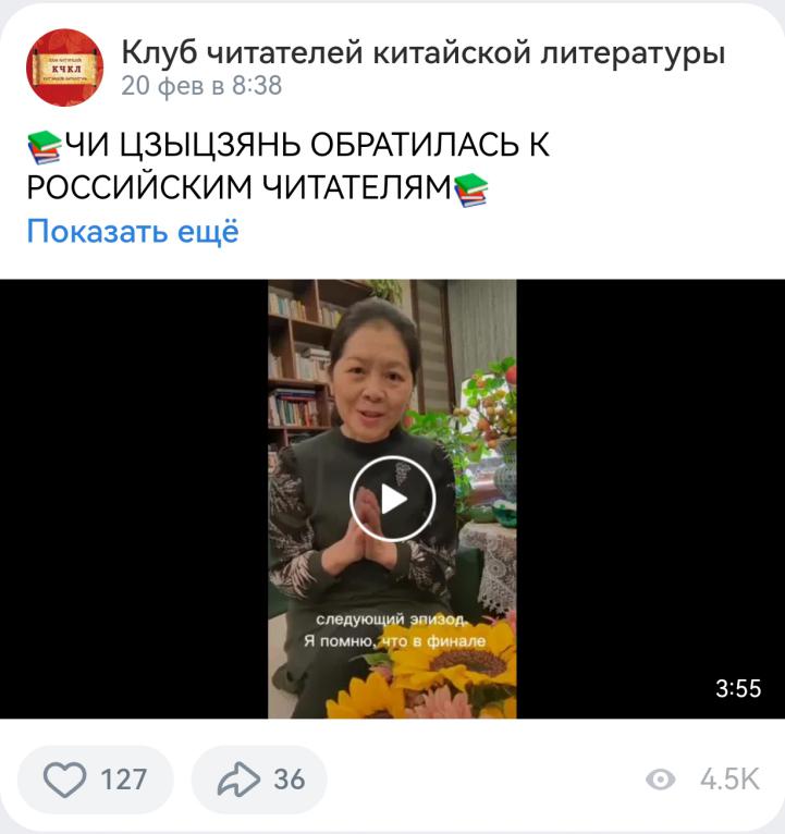活動(dòng)結(jié)束后,俄羅斯中國(guó)文學(xué)讀者俱樂(lè)部將遲子建女士的致辭視頻和推介會(huì)視頻發(fā)布在社交平臺(tái)上,短短兩天內(nèi)觀看量已突破4500次,充分展現(xiàn)了俄羅斯讀者對(duì)中國(guó)文學(xué)的濃厚興趣。