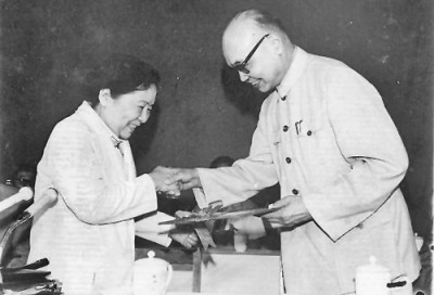 匡亞明(右)授予物理學(xué)家吳健雄南京大學(xué)名譽(yù)教授證書。作者供圖