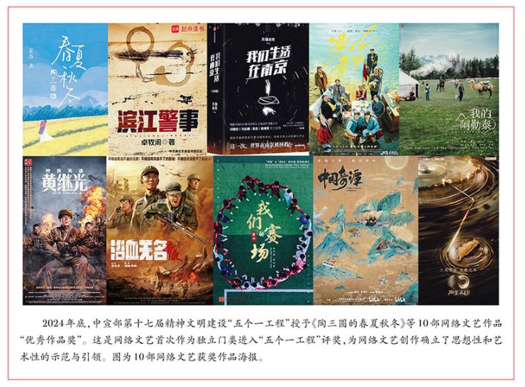 2024年底,中宣部第十七屆精神文明建設(shè)“五個一工程”授予《陶三圓的春夏秋冬》、《濱江警事》(第1部)、《我們生活在南京》3部網(wǎng)絡(luò)文學(xué)作品,《漫長的季節(jié)》、《我的阿勒泰》2部網(wǎng)絡(luò)劇,《特級英雄黃繼光》、《浴血無名·奔襲》2部網(wǎng)絡(luò)電影,系列紀(jì)錄片《我們的賽場》、網(wǎng)絡(luò)動畫片《中國奇譚》和網(wǎng)絡(luò)綜藝節(jié)目《聲生不息·寶島季》等10部網(wǎng)絡(luò)文藝作品“優(yōu)秀作品獎”。這是網(wǎng)絡(luò)文藝首次作為獨立門類進入“五個一工程”評獎,為網(wǎng)絡(luò)文藝創(chuàng)作確立了思想性和藝術(shù)性的示范與引領(lǐng)。