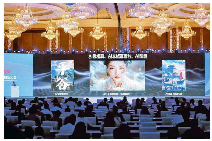 人工智能(AI)等高新技術(shù)成為提升網(wǎng)絡(luò)視聽文藝創(chuàng)作品質(zhì)和效率的新引擎。圖為2024年3月,第十一屆中國網(wǎng)絡(luò)視聽大會期間,發(fā)言嘉賓介紹AI技術(shù)在影視制作中的應(yīng)用。 國家廣播電視總局供圖
