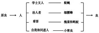 本文中的“蟲”指節(jié)肢動物門昆蟲綱動物,如蒼蠅、蚊子、螞蟻等。按照隱喻類別,魯迅筆下的蟲可分為“原蟲”“蚊蠅”“細(xì)腰蜂”“槐蠶和螞蟻”“小青蟲”,他們分別隱喻“進(jìn)化鏈條上的低級生物”“虛偽的學(xué)士文人(奴才們)”“治人者”“密密麻麻的看客”“自我和同道人”。