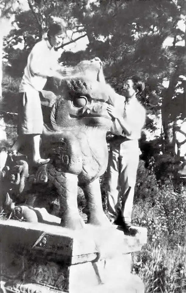 梁思成、林徽因系統(tǒng)調(diào)查測繪中國古建和雕刻,是在他們?nèi)谓號|北大學建筑系時從沈陽北陵起步的。有一張照片就是他們兩個正在測繪北陵神道兩邊神獸之麒麟。林徽因騎在麒麟背上,梁思成立在麒麟左前。照片的時間被梁家后人標為1929 年。雖然此時二人都在東北大學任教,但標為1929 年顯然不確。