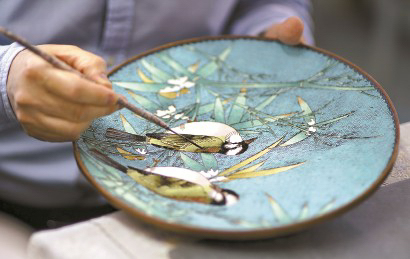 技師在為景泰藍工藝品進行“點藍”。 新華社 發(fā)