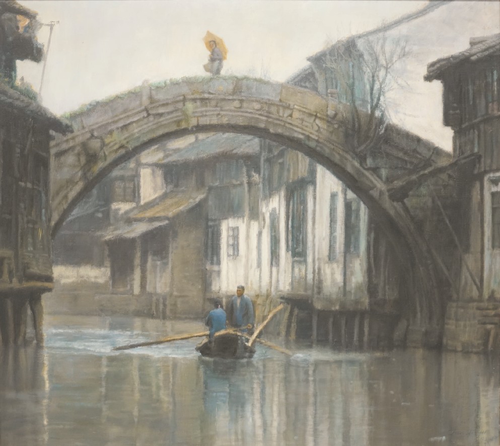 記者在展覽預(yù)展中看到,領(lǐng)銜此次展覽的,正是陳逸飛的四幅作品,分別為創(chuàng)作于1983年的《清晨》《后花園》《悠悠小船》,創(chuàng)作于1984年的《寧靜的傍晚》。它們均為藝術(shù)家標志性的江南水鄉(xiāng)圖景,寫實中蘊含著浪漫情懷的畫面,宛如光影交織的江南夢,頗具感染力。彼時,陳逸飛已赴美國深造,這些畫作無疑寄寓著他濃濃的鄉(xiāng)愁,也標志著其繪畫風(fēng)格的新突破。據(jù)陳逸鳴透露,1983年10月,陳逸飛在紐約哈默畫廊舉辦了在美國的第一次個人畫展,所有作品在開幕第一周內(nèi)便售罄,《后花園》和《清晨》便是其中的作品。