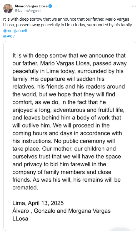 略薩的兒子阿爾瓦羅·巴爾加斯·略薩在社交媒體X上宣布了這個(gè)消息