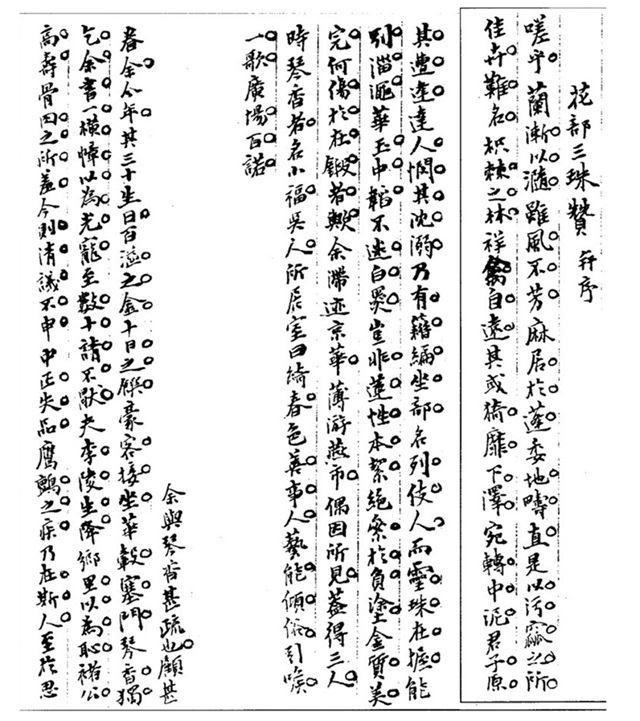 李慈銘曾請(qǐng)人抄錄自己日記中的文章,恰好這篇《花部三珠贊》被收錄在《越縵堂叢稿》中,今藏國(guó)家圖書(shū)館?!耙硪桓?,廣場(chǎng)百諾”之下寫(xiě)道:“吾鄉(xiāng)有鮑某者,家以鬻鹽富?;浛苤畞y,委質(zhì)賊庭??芡巳攵迹沟酶叩?,入翰林。嘗招琴香左觥賦,目之妻,稱真人,有戲以呼琴香者,琴香詢得其故,大慍,自是與鮑絕?!?/p>