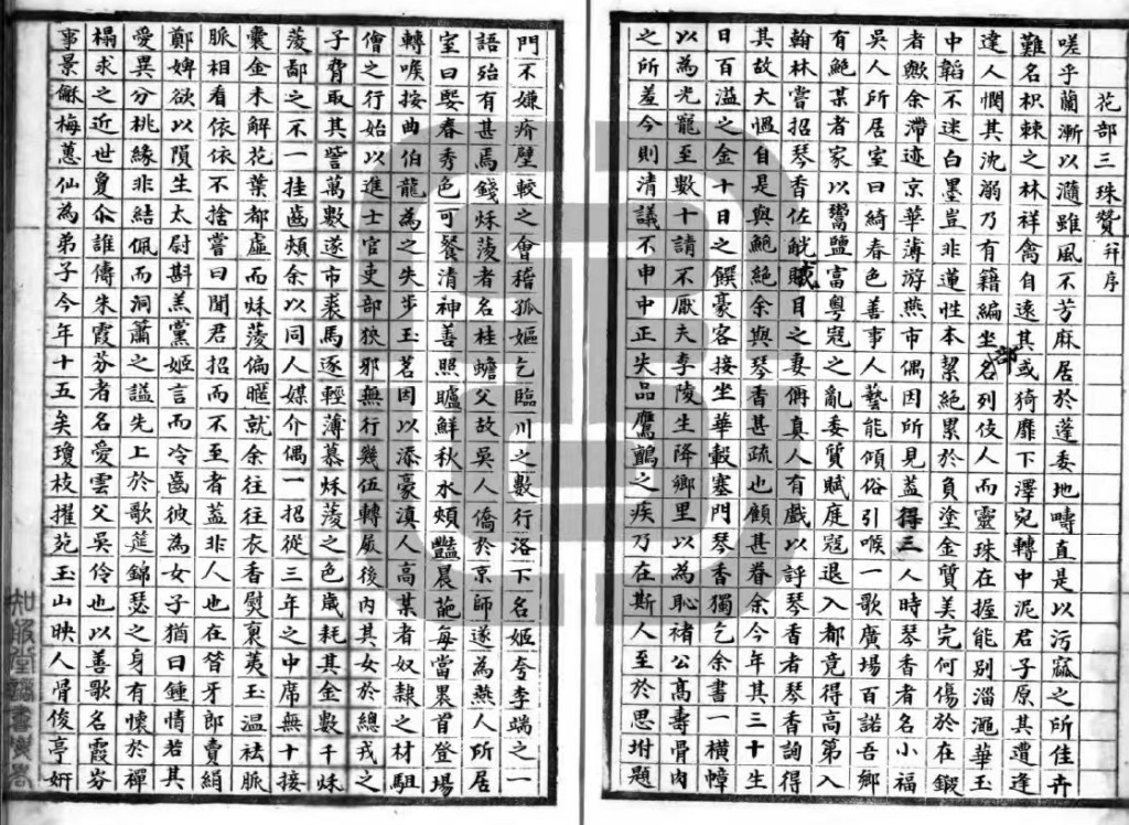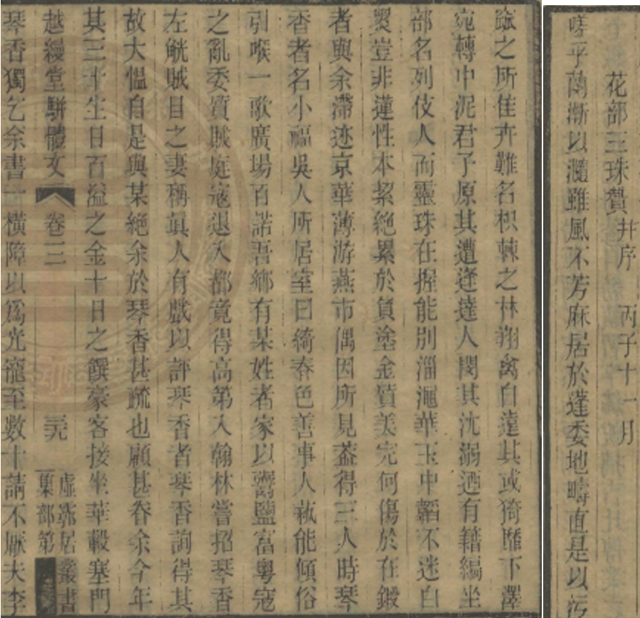 遺憾的是,這部分日記原稿今不知所藏何處,翻檢李氏文集,或許可尋出蛛絲馬跡。李慈銘生前委托曾之撰、曾樸父子刊刻駢文,這篇《花部三珠贊》就收在光緒二十三年(1897)曾氏父子校刊的《越縵堂駢體文》卷三,果然,“引喉一歌,廣場(chǎng)百諾”之下寫(xiě)道:“吾鄉(xiāng)有某姓者,家以鬻鹽富。粵寇之亂,委質(zhì)賊庭??芡巳攵?,竟得高第,入翰林。嘗招琴香左觥賦,目之妻,稱真人,有戲以呼琴香者,琴香詢得其故,大慍,自是與某絕?!备枥呻m以藝事周旋朱門,受人追捧,然隸屬樂(lè)籍,身份卑賤。某翰林學(xué)士縱情于狎優(yōu)之風(fēng),竟以納寵作妾相謔,將舞臺(tái)之上的才子佳人扮相混同現(xiàn)實(shí)倫理,不但踐踏優(yōu)伶人格,更折射出交游中隱伏的權(quán)力傾軋。時(shí)氏與之絕交,風(fēng)骨凜然,故李慈銘贊美其“蓮性本潔”。
