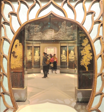 展覽最后一個單元展示了清宮舊藏戲曲樂器、戲本曲譜、五彩斑斕的戲衣等,并以現(xiàn)代設(shè)計手法展現(xiàn)了倦勤齋小戲臺。孫淼介紹,策展團(tuán)隊用3D打印技術(shù)制作出一個戲臺,利用鏡面屏幕再現(xiàn)倦勤齋室內(nèi)影像,虛實結(jié)合,為觀眾營造出置身其中的體驗。