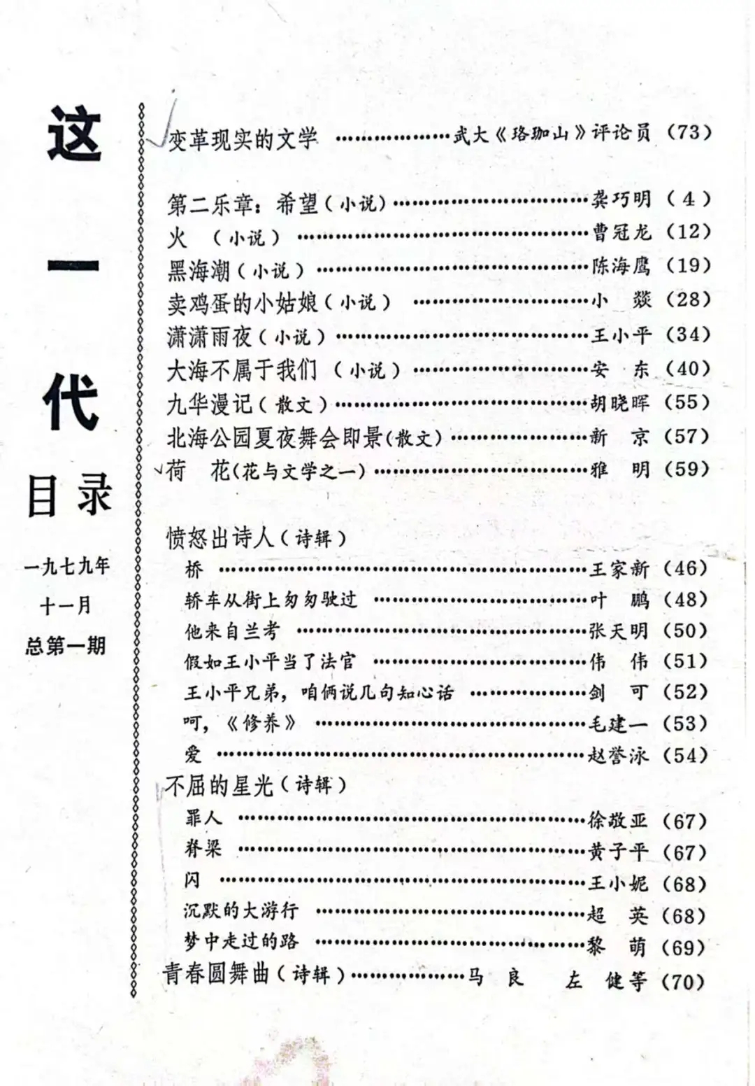 《這一代》創(chuàng)刊號(hào),“所缺的32頁(yè)中,有那篇《變革現(xiàn)實(shí)的文學(xué)》和兩組詩(shī),一組是寫十年動(dòng)亂中青年一代堅(jiān)韌不拔的足跡的,一組是反映新長(zhǎng)征進(jìn)軍中校園生活的?!?[35]前一組詩(shī)輯名為“不屈的星光”,具體篇目是:徐敬亞的《罪人》、王小妮的《閃》、黃子平的《脊梁》、黎萌的《夢(mèng)中走過的路》等;后一組詩(shī)輯名為“青春圓舞曲”,另有散文詩(shī)《心之歌》、雜文《雜文與打狗》“存目”。