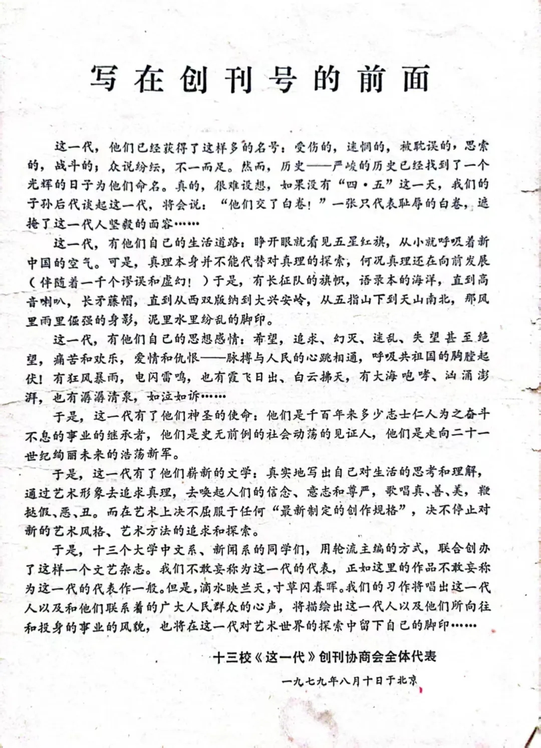 分析《這一代》里的文本,首先要從上文中提到的“發(fā)刊詞”談起,正式刊出時(shí)的篇名為《寫在創(chuàng)刊號(hào)的前面》,落款是:十三校《這一代》創(chuàng)刊協(xié)商會(huì)全體代表,時(shí)間署:1979年8月10日?,F(xiàn)摘引其最后一句話如下:
