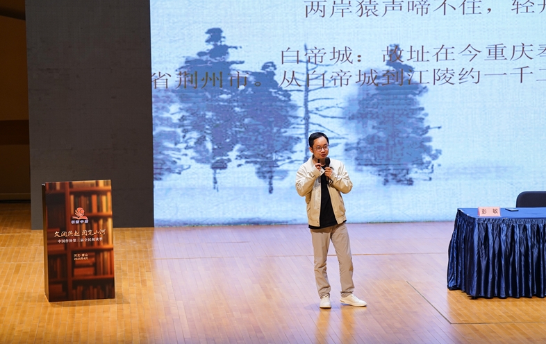 彭敏面向初中生主講《詩詞背后有乾坤》,聚焦古詩詞背后的歷史故事與文化內(nèi)涵。他打破“標簽化”的詩人形象,通過解析李白、杜甫等詩人的人生軌跡與創(chuàng)作背景,帶領學生理解詩詞中的情感邏輯與人文精神,感受古典文學跨越千年的生命力,引導青少年從詩詞中汲取文化養(yǎng)分。在問答互動環(huán)節(jié),彭敏帶來了歷史背后的有趣知識——端午節(jié)最初究竟是紀念誰的?屈原吃過粽子嗎?由此鼓勵學生們在閱讀中積極探索,主動追問,培養(yǎng)勤于思考拓展知識的良好習慣。