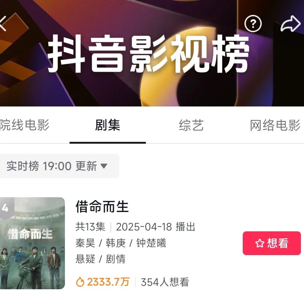 臨近開(kāi)播,電視劇《借命而生》愛(ài)奇藝預(yù)約量突破150萬(wàn),抖音劇集榜熱度值達(dá)2333.7萬(wàn)。