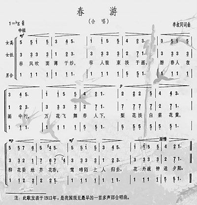 李叔同發(fā)表于1931年的《春游》,是我國現(xiàn)見最早的一部多聲部合唱曲。