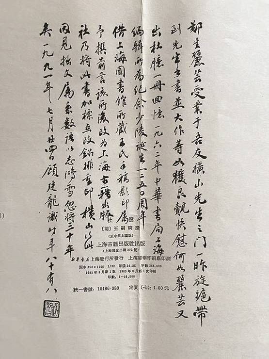橫山弘生前是奈良大學(xué)的教授,畢業(yè)于日本京都大學(xué),曾參與已故日本著名的唐代文獻研究專家、京都大學(xué)教授平岡武夫編撰《唐代研究指南》的工作。上世紀90年代,他見到排印本明代王嗣奭《杜臆》后所附顧老的《前言》,念及和顧老見過面,于是想請顧老在書上題字留念。他得到這份顧老的題跋手澤,正如題跋原文所說,是因當(dāng)時他指導(dǎo)的留學(xué)生鄭麗蕓女士的關(guān)系。鄭女士研究日本美術(shù),后來在日本的椙山女學(xué)園大學(xué)任教。