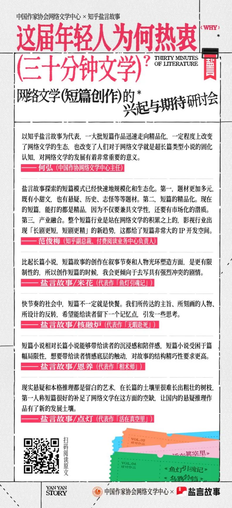 年輕人為何熱衷于“三十分鐘文學”?4月16日,由中國作協(xié)網(wǎng)絡文學中心、知乎鹽言故事主辦的“網(wǎng)絡文學短篇創(chuàng)作的興起與期待”研討會給出了答案。眾多專家學者、知乎鹽言作者圍繞優(yōu)秀短篇網(wǎng)文故事展開研討,共同剖析短篇化現(xiàn)象對網(wǎng)絡文學發(fā)展的意義。