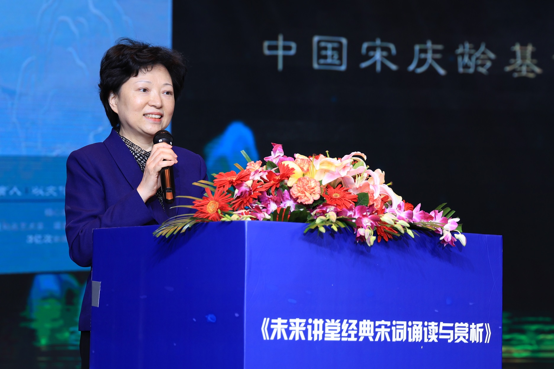 沈蓓莉在致辭中指出,宋詞作為中國文學(xué)的璀璨瑰寶,傳遞出深厚的文化底蘊與真摯的家國情懷?!段磥碇v堂——經(jīng)典宋詞誦讀與賞析》精選宋詞名篇,以當(dāng)代視角解讀經(jīng)典,用青春語言對話古人,為青少年更好了解宋詞搭建了一座橋梁。她表示,中國宋慶齡基金會致力于服務(wù)青少年全面發(fā)展。在“全民閱讀活動周”之際舉辦本次活動,是踐行落實習(xí)近平文化思想的重要舉措,也是響應(yīng)全民閱讀倡議的具體實踐,希望以此推動青少年養(yǎng)成閱讀習(xí)慣,增強閱讀能力,提升閱讀質(zhì)量,為形成全社會愛讀書、讀好書、善讀書的濃厚氛圍貢獻一份力量。