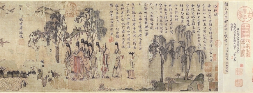 需要注意的是,《洛神賦圖》為文學(xué)作品基礎(chǔ)上的“再創(chuàng)作”,在立意、構(gòu)思、構(gòu)圖、塑造人物等方面,要達(dá)到與文學(xué)作品異曲同工之效。立足現(xiàn)實(shí),又不拘泥于現(xiàn)實(shí);超脫現(xiàn)實(shí),又不與現(xiàn)實(shí)相脫離,顧愷之在若即若離、似與不似之間,完成了從文學(xué)語言到繪畫語言的轉(zhuǎn)換。所畫故事情節(jié)與人物神態(tài)關(guān)聯(lián)緊密,人物表情生動(dòng),眼眸沒有多余的勾染,落筆精準(zhǔn),有“傳神動(dòng)人”之效——不妨仔細(xì)觀察一下曹植與洛神的目光,始終沒離開過對方;如果人物的動(dòng)態(tài)所向不能與目光對應(yīng)起來,顧愷之認(rèn)為是“大失”,他圍繞這一觀點(diǎn)提出了“以形寫神”論。以工筆重彩技法繪于絹本之上,高古游絲描灑脫流暢,景物畫法稚拙古樸,設(shè)色艷麗而不媚俗,與《洛神賦》絢麗的文采和宏偉的構(gòu)架和諧統(tǒng)一?;陂L卷構(gòu)圖,《洛神賦圖》以情節(jié)布局,分合相宜,取舍得當(dāng),采用散點(diǎn)透視,疏密關(guān)系、虛實(shí)關(guān)系均穩(wěn)妥處理。