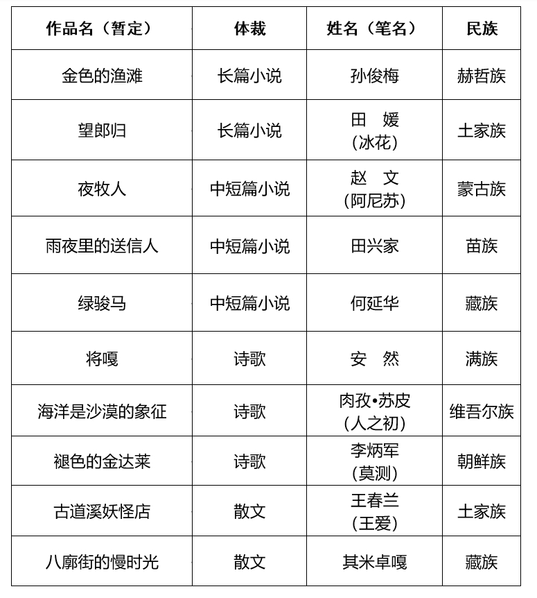 中國(guó)作協(xié)2025年度“鑄牢中華民族共同體意識(shí)·中國(guó)少數(shù)民族文學(xué)之星叢書(shū)”項(xiàng)目經(jīng)過(guò)專(zhuān)家論證和中國(guó)作家協(xié)會(huì)書(shū)記處審批,已確定入選作品10部,擬由作家出版社出版。
