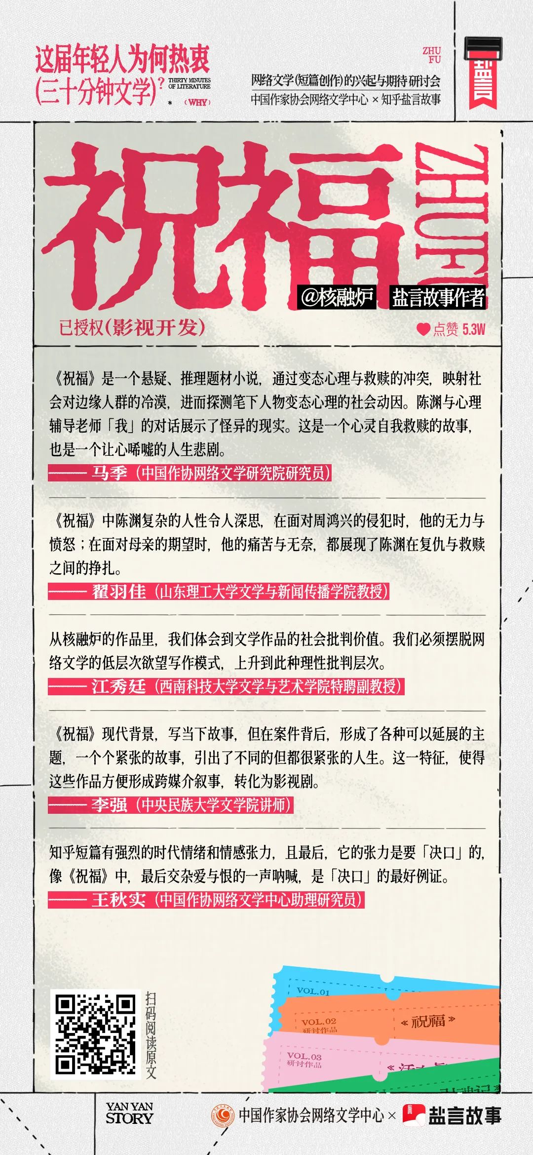 核融爐,1996年生。知乎鹽言故事獨(dú)家簽約作者,擅長(zhǎng)懸疑題材創(chuàng)作。代表作《無(wú)暇赴死》《最佳損友》《祝褔》《不可兒戲》《戲劇課》《迷霧》等,多部作品售出影視版權(quán)?!恫豢蓛簯颉帆@2024鹽言故事短篇故事影響力榜“鹽選好IP:最具影視價(jià)值”獎(jiǎng)。短篇懸疑專(zhuān)欄《隱秘愛(ài)意游戲》位居知乎鹽言故事懸疑口碑榜第一。出版短篇小說(shuō)作品集《謀殺前夜》。