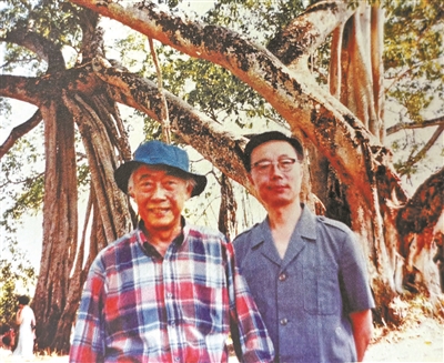 1991年春,張守仁老師與汪曾祺先生旅游云南期間,兩人合影于一木成林的大青樹下