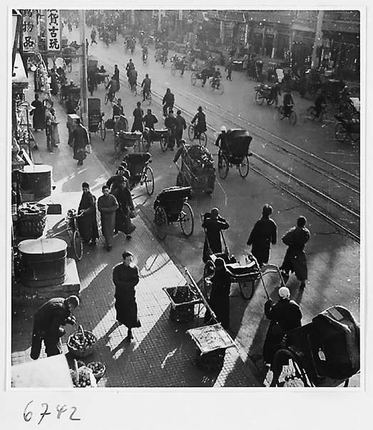 1933年,西單北大街行人、洋車、自行車交錯(cuò)。此時(shí)已通電車,人們對洋車的需求越來越低。
