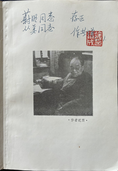徐鑄成是文匯報(bào)的創(chuàng)辦人之一,1957年以后離開(kāi)了《文匯報(bào)》,晚年曾來(lái)參加過(guò)《文匯報(bào)》的活動(dòng),依稀記得見(jiàn)過(guò)他的一個(gè)背影。手頭這本徐鑄成簽贈(zèng)給謝蔚明的《杜月笙正傳》,浙江人民出版社,1982年6月第一版,是我?guī)啄昵霸谂f書店淘到的。在“作者近照”的上方,徐鑄成鋼筆題寫:“蔚明同志、從美同志存正。作者贈(zèng),82.11.”鈐白文“徐鑄成印”。