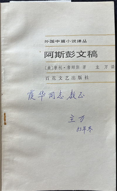 我買到的這本《阿斯彭文稿》,書名頁(yè)有譯者主萬(wàn)的題詞:“霞華同志教正。主萬(wàn),83年冬”。霞華應(yīng)該就是譯者曾經(jīng)的同事、華東師范大學(xué)外文系教授楊霞華,錢谷融的太太。錢谷融先生是很熟悉的,以前好多文學(xué)活動(dòng)都能見(jiàn)到他,慈眉善目、笑容可掬。而這位楊教授我無(wú)緣識(shí)荊。曾在吳俊的《追思我的導(dǎo)師錢谷融先生》一文中讀到,他們師生倆有次談到戀愛(ài)問(wèn)題,錢先生對(duì)吳俊說(shuō):“我也有苦惱啊,楊先生有時(shí)發(fā)起脾氣來(lái),會(huì)過(guò)來(lái)揪著我的耳朵從這個(gè)房間拉到那個(gè)房間?!眳强懙溃骸皸钕壬俏业膸熌?,華東師大外語(yǔ)系的資深教授,年長(zhǎng)先生四歲,師母任副教授時(shí),先生還是小講師?!以谙壬依?,多次聽(tīng)到隔壁楊先生直呼先生的名字,而先生說(shuō)起師母則總是楊先生三字?!保S平主編《師大憶舊(華東師大卷)》,江蘇鳳凰文藝出版社,2022年1月版,73頁(yè))