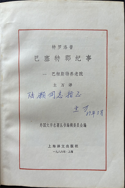 主萬(wàn)先生與我卻有過(guò)一段交往。上世紀(jì)八十年代后期,我采訪了多位滬上老翻譯家,曾去華山路主萬(wàn)先生府上拜謁,聽(tīng)他介紹剛完成翻譯的英國(guó)作家特羅洛普。主萬(wàn)先生在上世紀(jì)五十年代曾翻譯了特羅洛普長(zhǎng)篇小說(shuō)《巴塞特郡紀(jì)事》的第一部《巴徹斯養(yǎng)老院》,三十年后又完成第二部《巴徹斯特大教堂》的翻譯。我在介紹文章中說(shuō)這部小說(shuō)“給了我們一些比民族性更廣泛、更深遠(yuǎn)的東西,最終是來(lái)源于對(duì)人類的一種透徹、全面的認(rèn)識(shí)與了解”,肯定是主萬(wàn)先生說(shuō)的話。《養(yǎng)老院》和《大教堂》收入“外國(guó)文學(xué)名著叢書”,分別于1986年6月和1987年1月由上海譯文出版社出版,主萬(wàn)先生都簽名送了我。