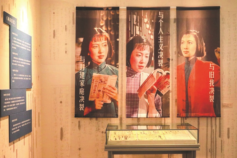 《青春之歌》是楊沫的代表作,展現(xiàn)了林道靜在黨的領導下從一個小知識分子成長為革命者的經(jīng)歷。此部分選取了“作品”這一敘事視角,選取了“求索”這一敘事主題。小說改編成電影《青春之歌》后影響極大,于是策展人員想到利用影視劇中的人物形象展現(xiàn)知識分子的心靈變遷。展廳中可以看到穿著學生裝眼神單純、與封建家庭決裂的林道靜,穿著旗袍低頭讀書、與個人主義決裂的林道靜,穿著紅毛衣眼神堅定、與舊我決裂的林道靜。這三個形象被做成大幅的紗幔,紗幔下則是與每一次抉擇相對應的手稿,形象與手稿之間形成呼應。策展人員還邀請獲得“《青春之歌》獎學金”的大學生重讀此書并撰寫感受,不同年代的讀者對林道靜有不同的體會,這進一步豐富了觀展體驗。